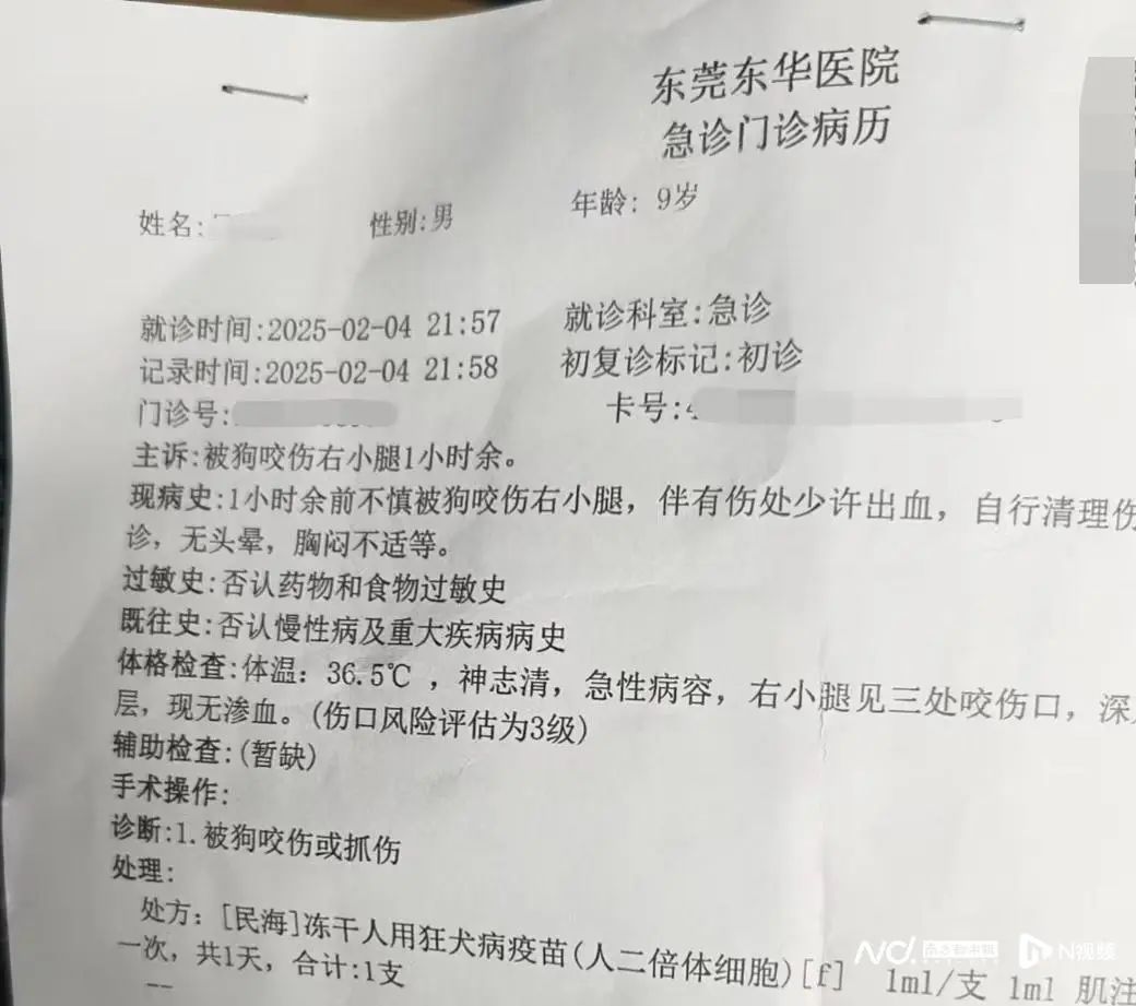 事发当晚,小华的父亲带孩子前往医院接种疫苗并报警。根据医院急诊的病历记录,其右小腿见三处咬伤口,诊断为被狗咬伤或抓伤。