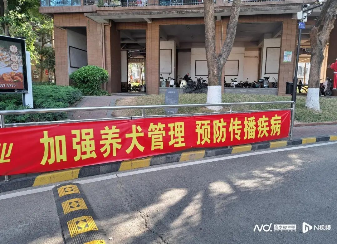 据介绍,目前物业中心正在对小区内的宠物犬只信息进行摸查,以了解犬只的数量、品种、疫苗等情况。记者在小区看到,物业人员在楼层大堂原先已张贴养狗提示的基础上,制作了宣导文明养狗的横幅,张贴在小区各出入口。