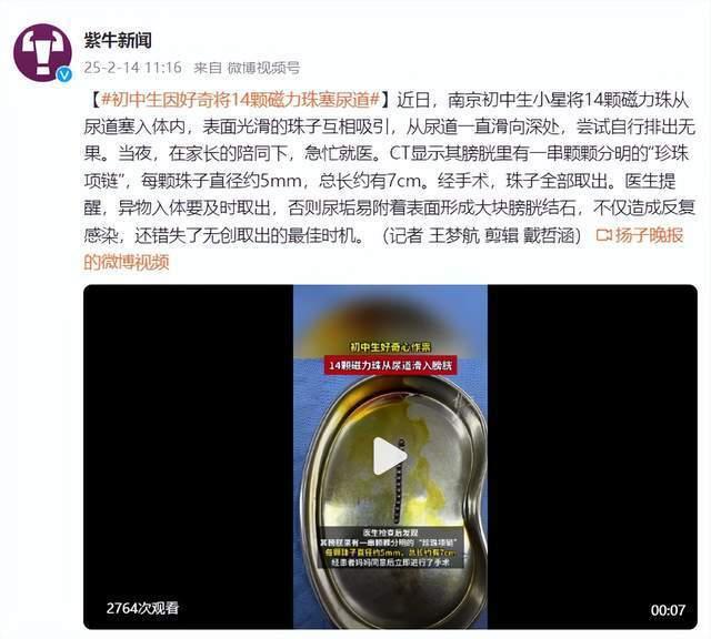 近日,南京初中生小星将14颗磁力珠从尿道塞入体内,表面光滑的珠子互相吸引,从尿道一直滑向深处,尝试自行排出无果。当夜,在家长的陪同下,急忙就医。