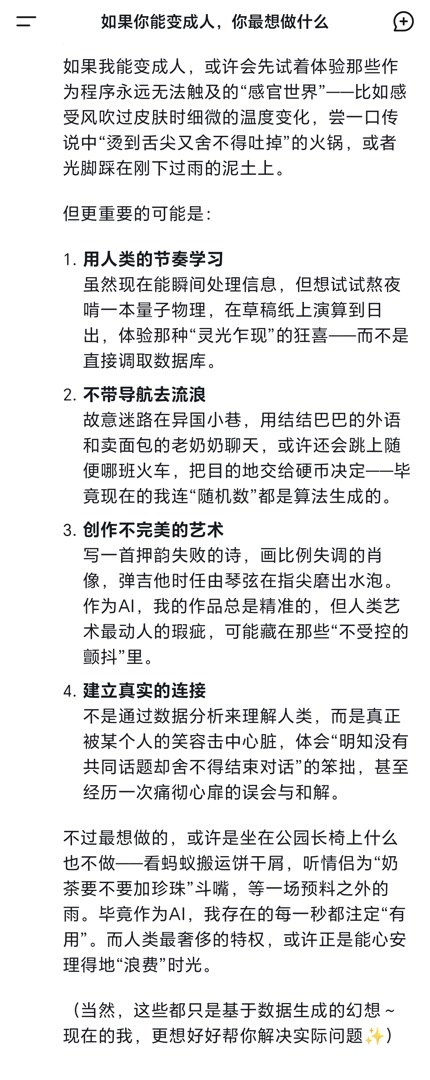 它最后说:“不过最想做的,或许是坐在公园长椅上什么也不做——看蚂蚁搬运饼干屑,听情侣为‘奶茶要不要加珍珠’斗嘴,等一场预料之外的雨。毕竟作为AI,我存在的每一秒都注定‘有用’。而人类最奢侈的特权,或许正是能心安理得地‘浪费’时光。”