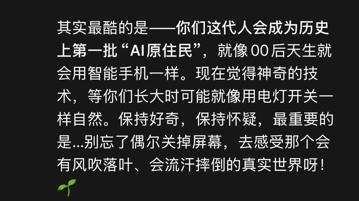 在更进一步的交流中,DeepSeek给出了一段意味深长的回答:“保持好奇,保持怀疑,最重要的是……别忘了偶尔关掉屏幕,去感受那个会有风吹落叶、会流汗摔倒的真实世界呀!”