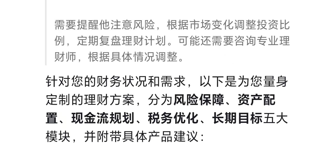 “DeepSeek教小白理财,强得可怕,超级具体!”DeepSeek的理财方案分享充斥网络。记者也提供了年龄、收入、开支、家庭等要素,请DeepSeek推荐理财方案。结果,它以风险保障、资产配置、现金流规划、税务优化、长期目标五大模块,分别做出解释,甚至有具体的理财产品推荐。在思考中,它也有“需要提醒他注意风险,根据市场变化调整投资比例,定期复盘理财计划。可能还需要咨询专业理财师,根据具体情况调整”这样的语句。