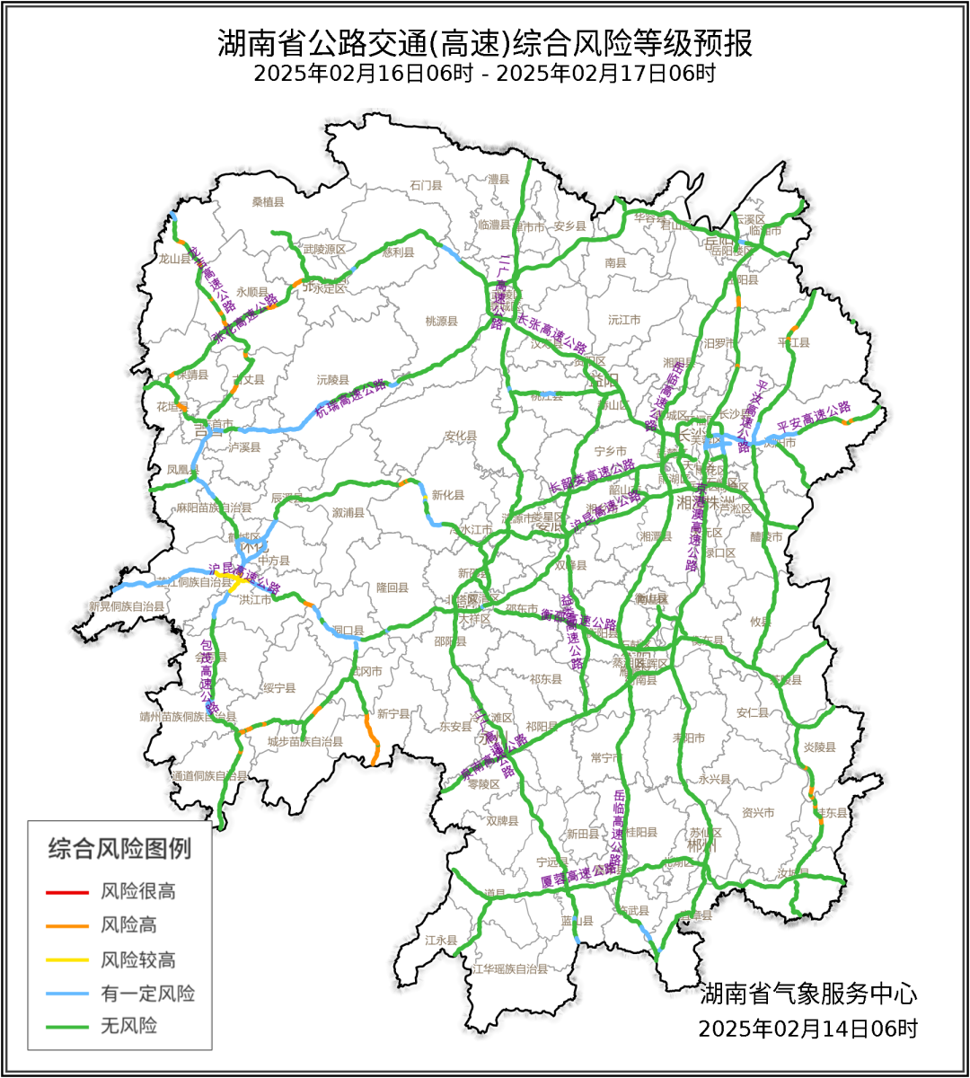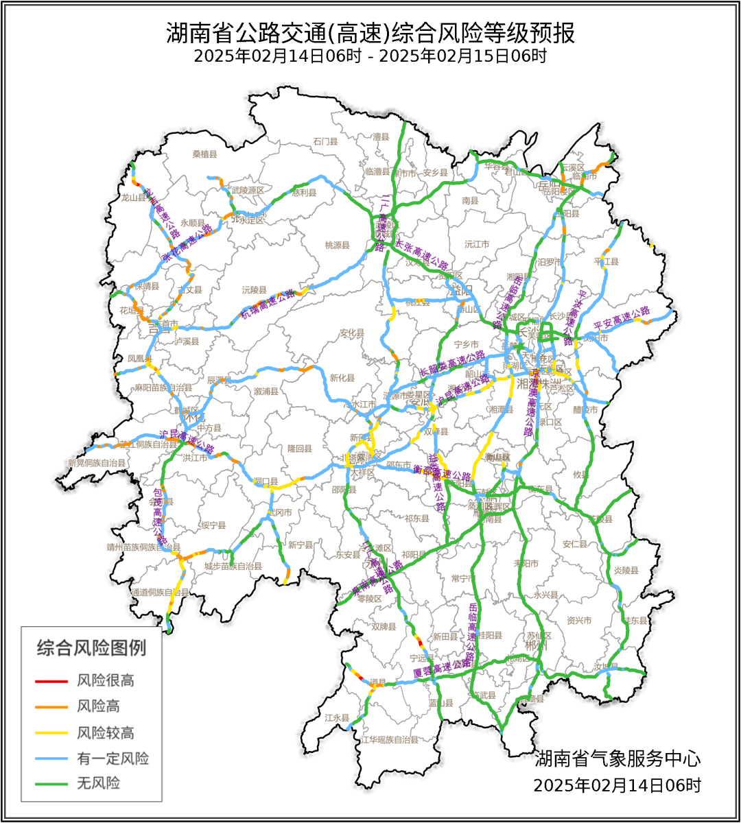 14-15日,受降水影响,道路湿滑、能见度下降风险较高;16日清晨,湘中以北部分路段受大雾影响,低能见度风险较高。