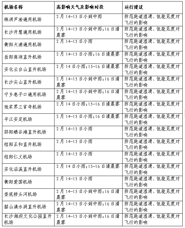 2月14日-15日受降水影响能见度下降,16日清晨湘中以北部分机场受大雾影响,能见度低,影响飞行安全。