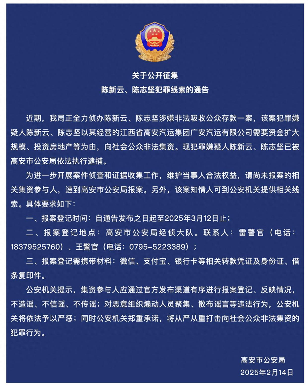 近期,我局正全力侦办陈新云、陈志坚涉嫌非法吸收公众存款一案,该案犯罪嫌疑人陈新云、陈志坚以其经营的江西省高安汽运集团广安汽运有限公司需要资金扩大规模、投资房地产等为由,向社会公众非法集资。现犯罪嫌疑人陈新云、陈志坚已被高安市公安局依法执行逮捕。