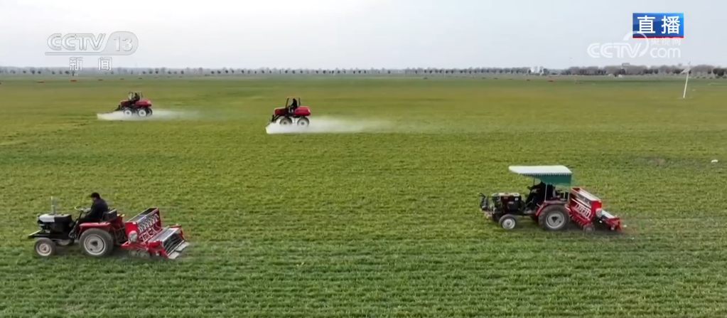 记者来到河南周口商水县的麦田里,这里是一块连起来超过1万亩的高标准农田。在记者身后多台农机设备在田间穿梭,加紧开展春季麦田管理。一年之计在于春,这两天河南的最高气温超过了10摄氏度,伴随着气温回升,小麦的生长进程加快,要从越冬期陆续进入到返青、起身期,也就是说小麦要开始长个了,因此对水肥的需求旺盛。这块地的麦田管理是分三步走的模式:施肥、浇水和病虫草害防治。