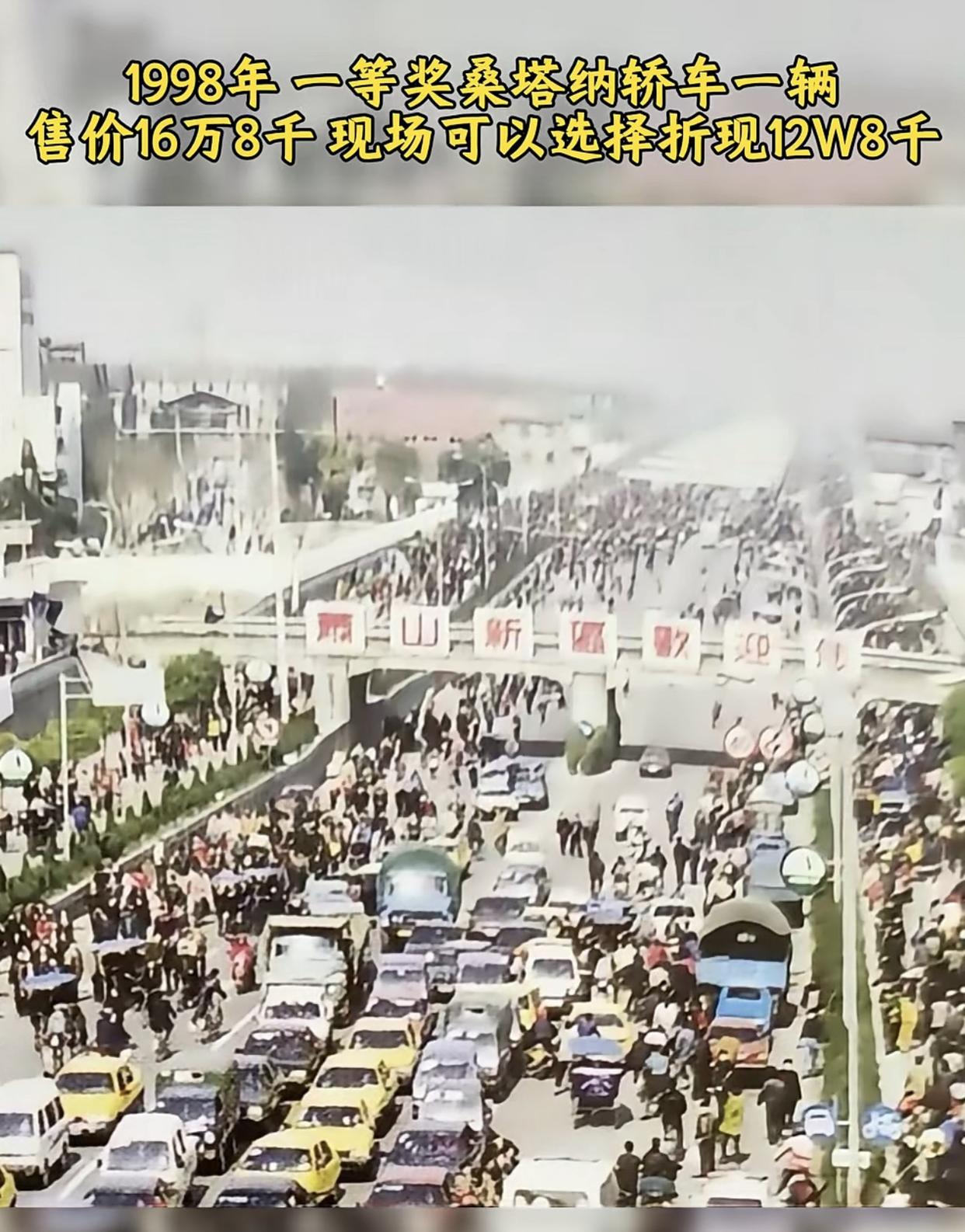 “1998年,一等奖桑塔纳轿车一辆,售价16万8千,现场可以选择折现12万8千……”