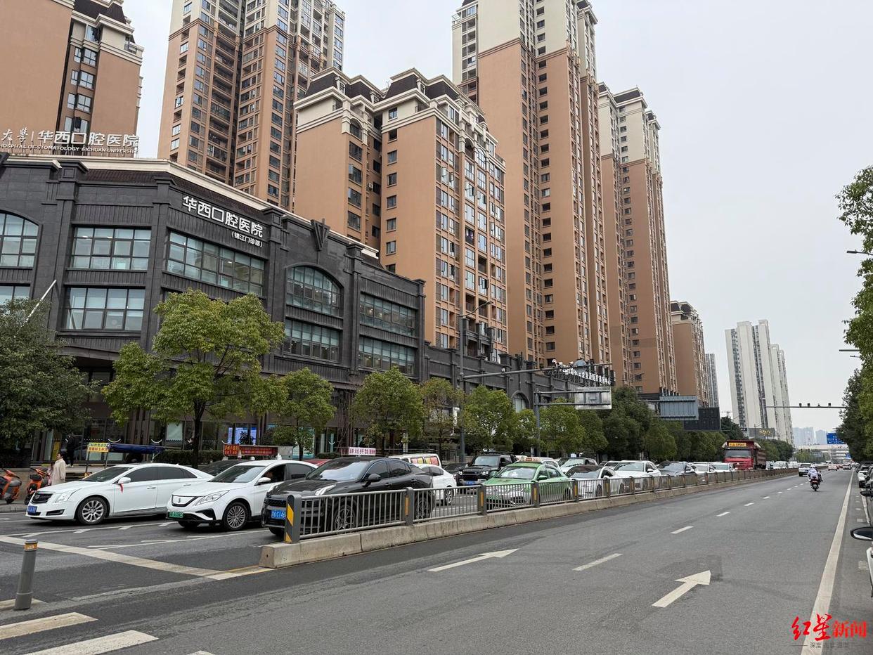14日上午9时许,记者来到华西第二医院锦江院区,驱车行驶至椰树街,准备向白桦林路转弯时,现场已排起了长长的车队。