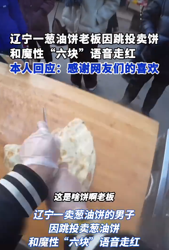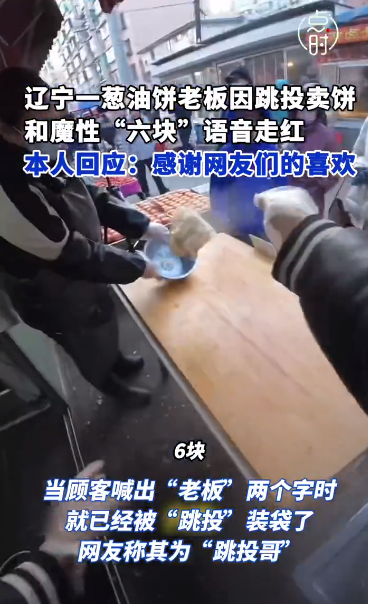 近日,辽宁一卖葱油饼的男子因跳投卖葱油饼和魔性“六块”语音走红,当顾客喊出“老板”两个字时,葱油饼就已经被“跳投”装袋了,网友称其为“跳投哥”。