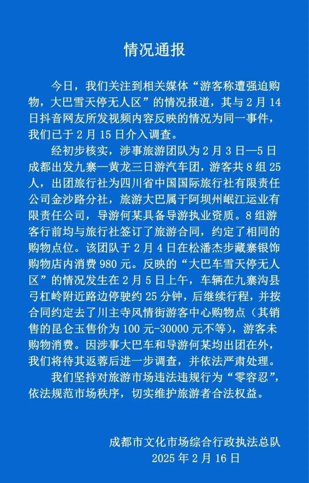 经初步核实,涉事旅游团队为2月3日一5日成都出发九寨一黄龙三日游汽车团,游客共8组25人,出团旅行社为四川省中国国际旅行社有限责任公司金沙路分社,旅游大巴属于阿坝州岷江运业有限责任公司,导游何某具备导游执业资质。8组游客行前均与旅行社签订了旅游合同,约定了相同的购物点位。该团队于2月4日在松潘杰步藏寨银饰购物店内消费980元。反映的“大巴车雪天停无人区”的情况发生在2月5日上午,车辆在九寨沟县弓杠岭附近路边停驶约25分钟,后继续行程,并按合同约定去了川主寺风情街游客中心购物点(其销售的昆仑玉售价为100元-30000元不等),游客未购物消费。因涉事大巴车和导游何某均出团在外,我们将待其返蓉后进一步调查,并依法严肃处理。
