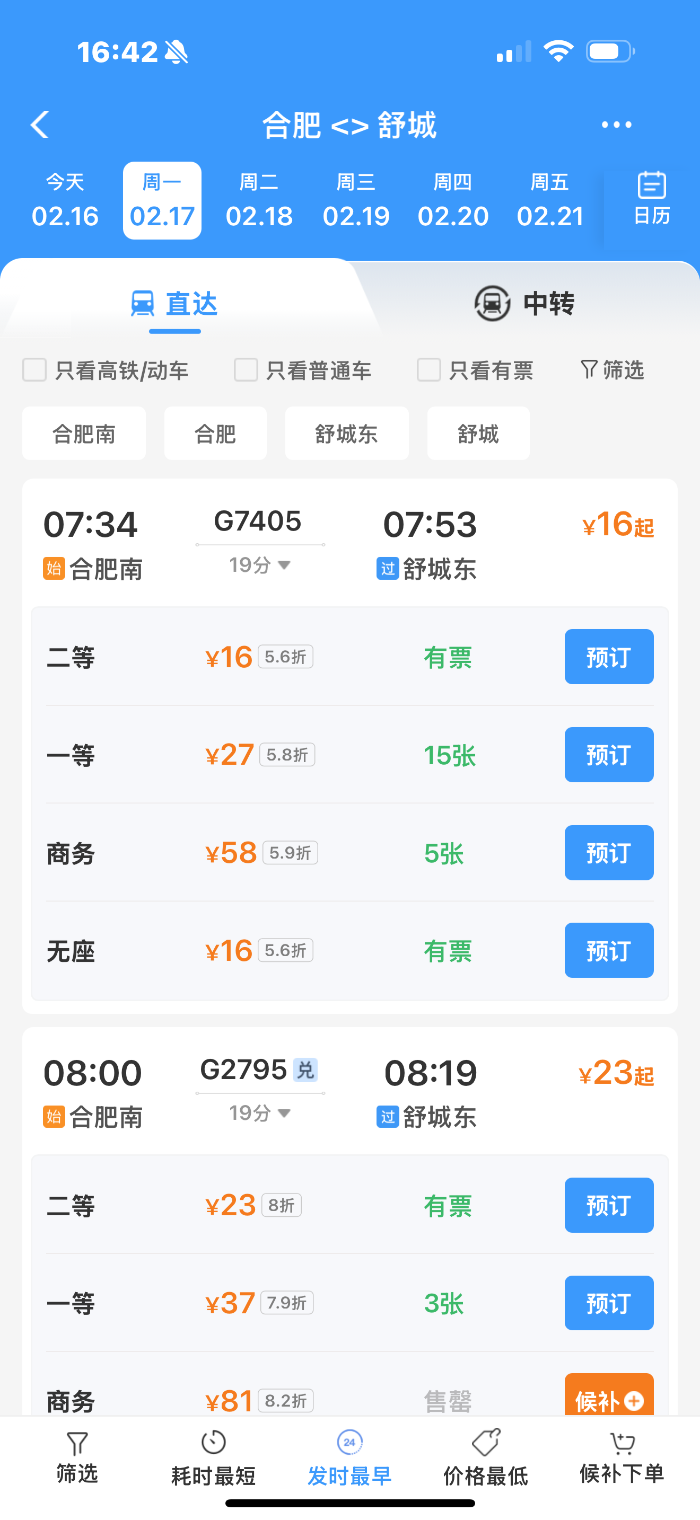 当前,长三角多个方向的高铁列车,也放出了不同折扣的优惠票。比如,从合肥站到阜阳西站G7788次列车,20:51合肥出发,22:02到阜阳西,2月21日、2月23日二等座票价仅需5.6折70元,其余日期也有7.2折;合肥到舒城高铁19分钟,二等座票价5.6折后仅需16元。上海至蚌埠高铁仅需1时57分,二等座票价最低5.8折87元起。