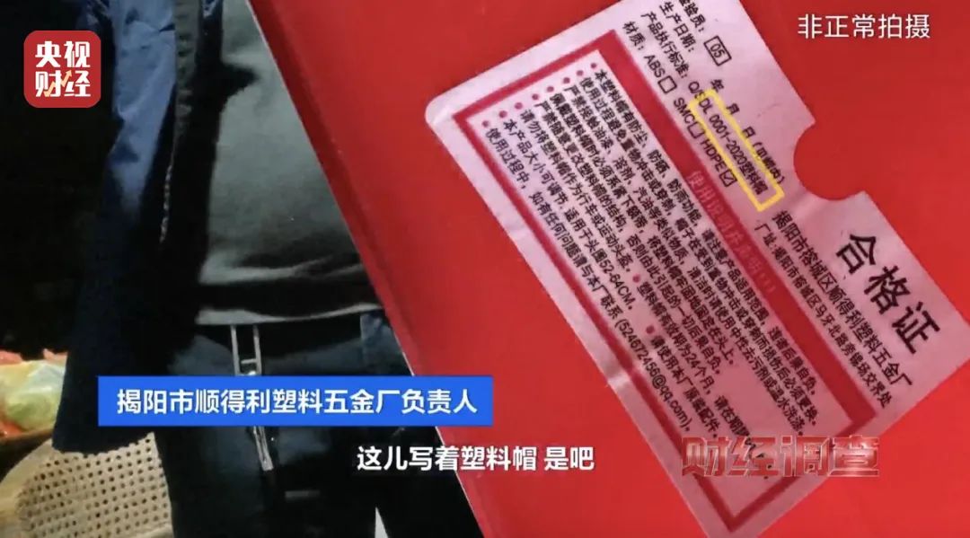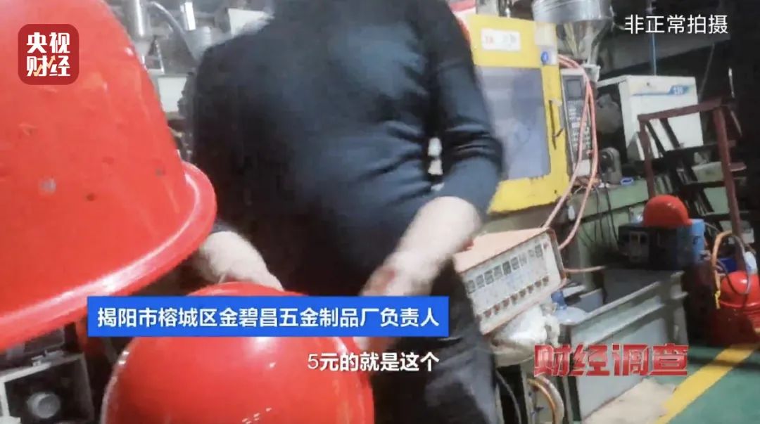在广东揭阳一家塑料五金厂,记者看到他们使用同一套机床生产安全帽和塑料帽,因此两者外形上几乎一致。但塑料帽所用的材料比安全帽便宜,性能也大打折扣,因此无法达到安全帽的防护要求。他们还告诉记者,监管不严的工地,大部分使用的是这种塑料帽。