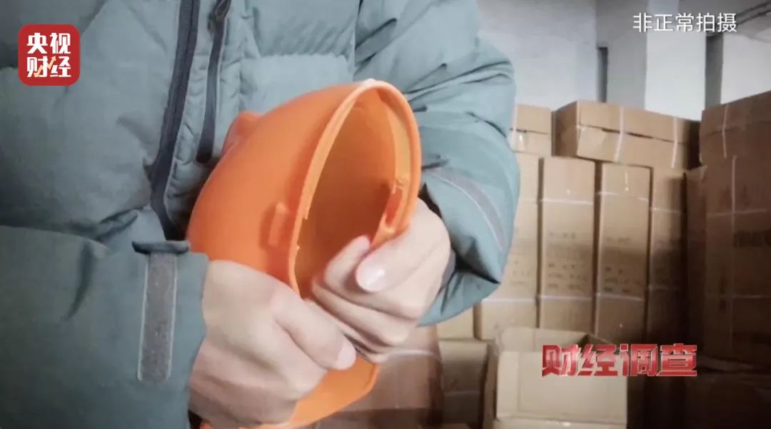 仓库里堆满了等待发货的安全帽,记者打开其中一个包装箱,随意拿起一顶安全帽,只是用手的力量向内施压,这顶安全帽就变形了。