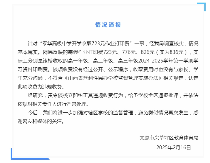 针对“泰华高级中学开学收取723元作业打印费”一事,经太原尖草坪区教育体育局调查核实,情况基本属实。网民反映的寒假作业打印费723元、776元、826元(实为836元),实际上分别是该校收取的高一年级、高二年级、高三年级2024-2025学年第一学期学习资料印刷费。该项收费没有经过公开、公示程序,收取费用时也没有与家长、学生充分沟通,不符合《山西省营利性民办学校监督管理实施办法》相关规定,认定此项收费为违规收费。