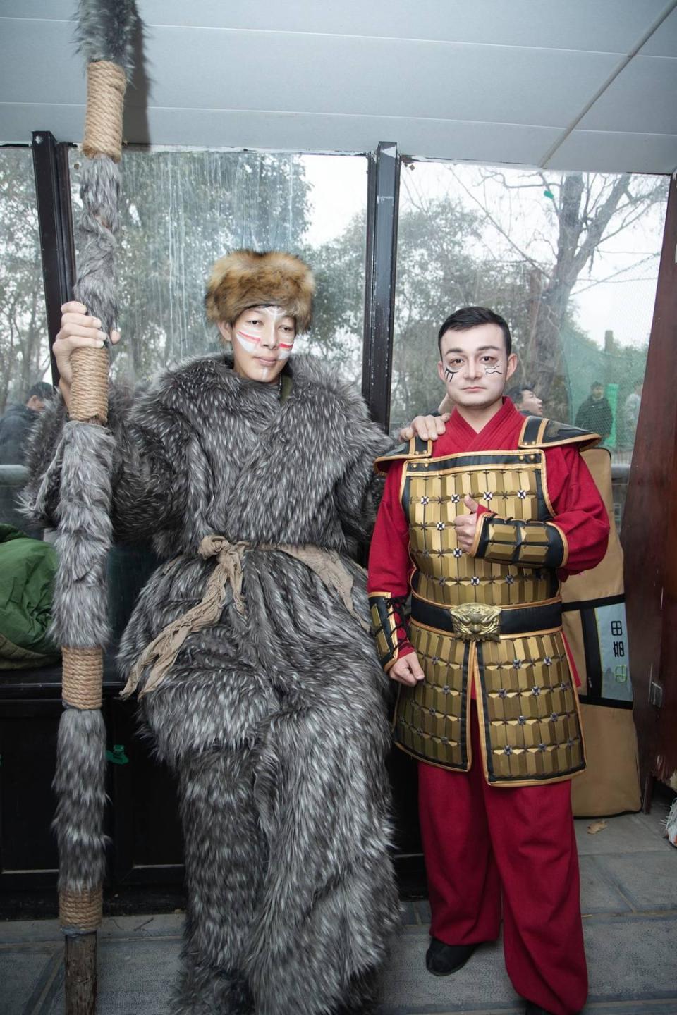 在河南开封万岁山大宋武侠城的仿宋街上,每天上午10时,“锵”一声铜锣响后,穿着灰白皮草的阿卜杜卡哈尔拄着“权杖”,自城楼缓步而下。身高1.65米的弟弟努尔艾力·赛麦提,像“带刀侍卫”一样紧紧守在哥哥身旁,形成鲜明的反差。