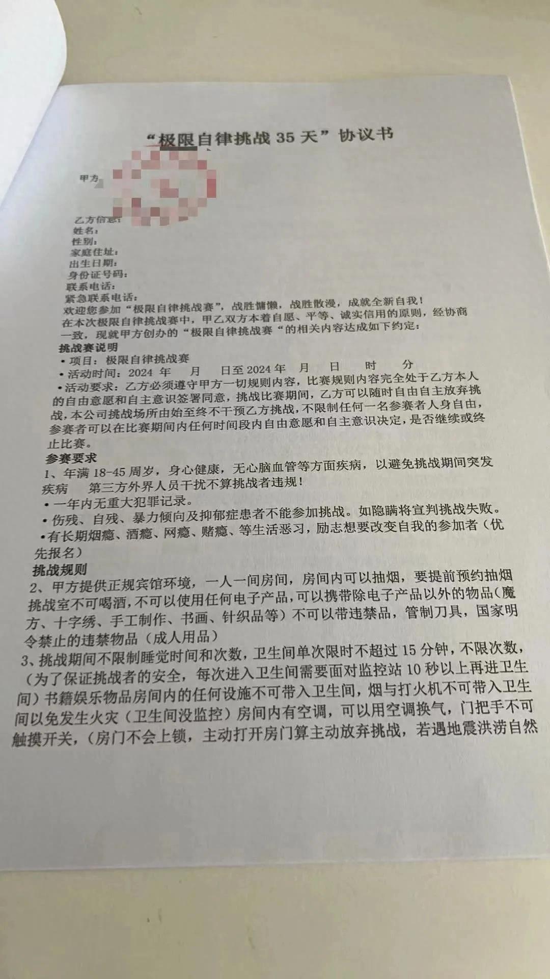2024年9月底,张有志从上海飞往成都参加某工作室的自律挑战。工作人员向他展示了需要签订的合同,密密麻麻写满了挑战规则:挑战者整个面部在监控下不可遮挡,不可超出监控范围,如发生遮挡每次不超过3秒,超过3秒算违规挑战失败;每天 24小时内可使用一次手机,北京时间 10 点到11点可使用手机3分钟;挑战期间不可与外界交流,不能肢体动作交流,不能主动开口跟工作人员讲话……