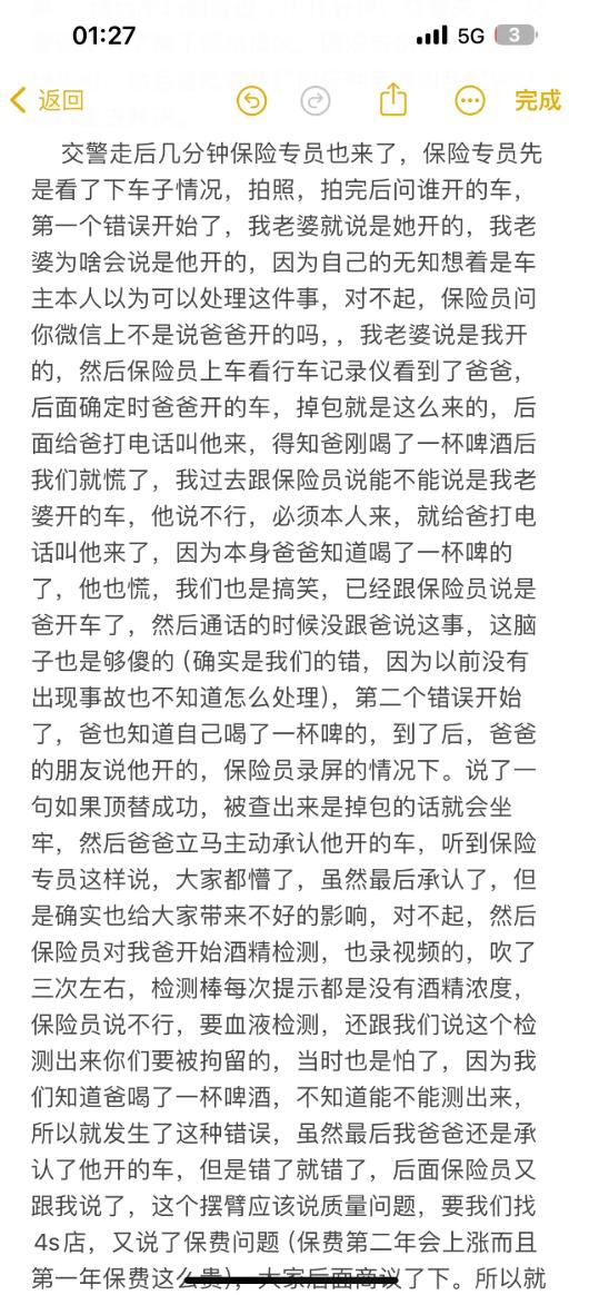 随后,保险要求父亲到场来处理事故,但此时他父亲在酒席上刚喝了一杯啤酒。由于担心被误查是酒驾,他父亲谎称是朋友开的。