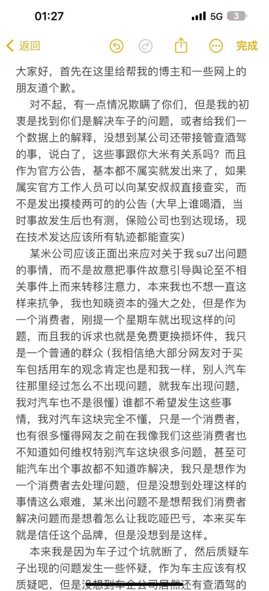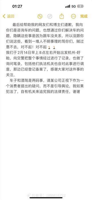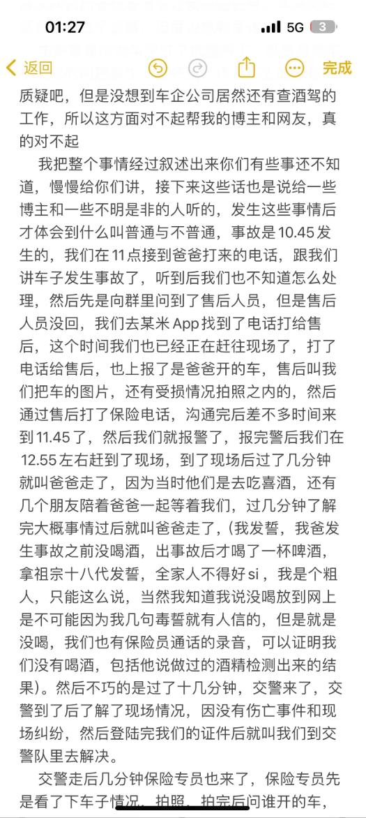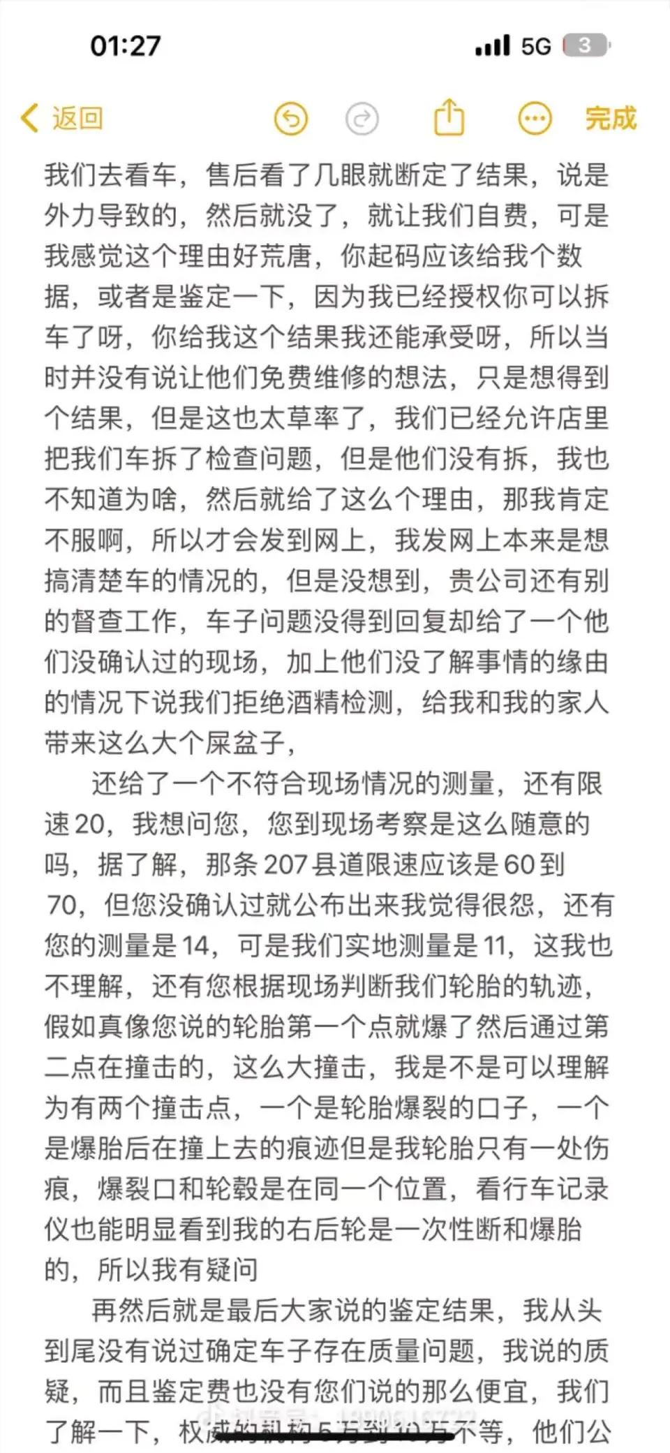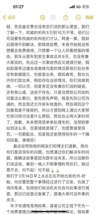日前,当事车主发布长文回应此事,车主称有一点情况欺瞒了网友,他当初的初衷是解决车子的问题,或者给一个数据的解释,但没想到厂商还接管查酒驾的事,他发誓父亲是在事故后才喝酒的。