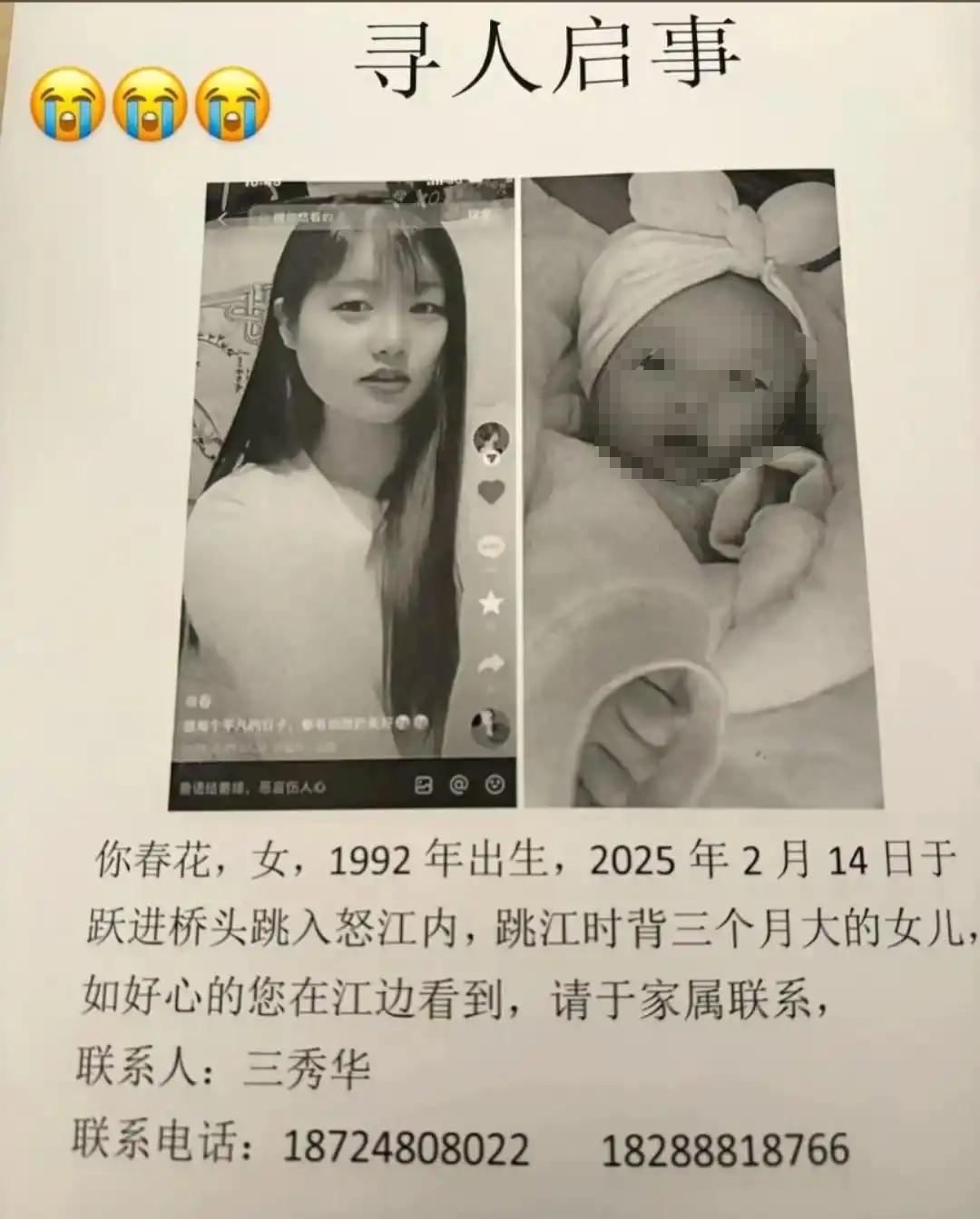 近日,一则寻人启事在网络上引发广泛传播。寻人启事显示,1992年出生的你春花,于2月14日背着三个月大的女儿跳入怒江,希望有目击者联系家属。