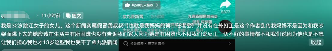 随后潇湘晨报记者注意到,网络上一人发布视频称,报道存在不实,视频发布者称,自己是跳江女子的大女儿,母亲并不是因为争吵跳江,发布者表示,母亲平时在生活中有所困难也并不会告诉家人,发声人为母亲的第二任丈夫,自己作为未成年对于报道内容不能接受。