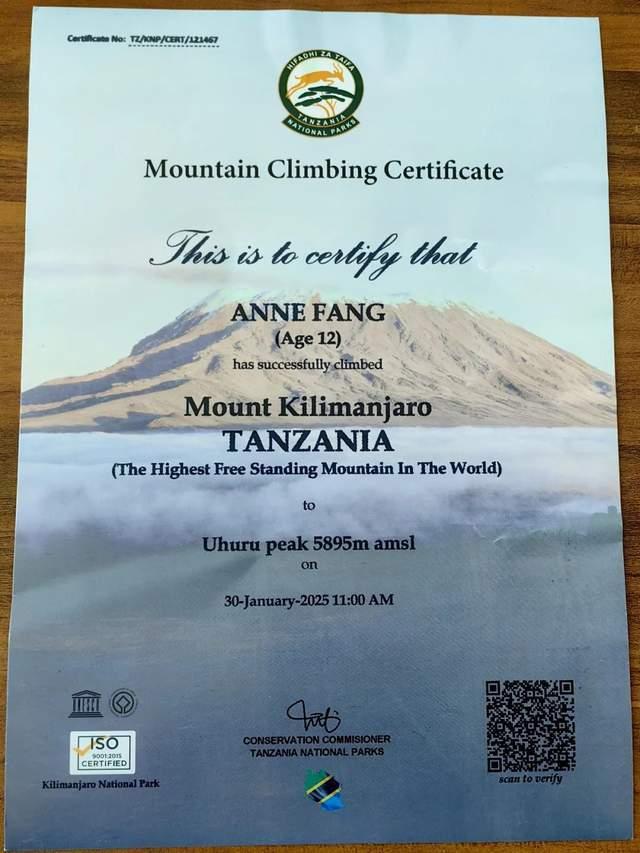 根据当地规定,只有年满12周岁才能申请乞力马扎罗山的攀登行为,12岁56天完成登顶的杭州女孩方瑾瑜,是目前有记录的最小的中国登顶成功者。