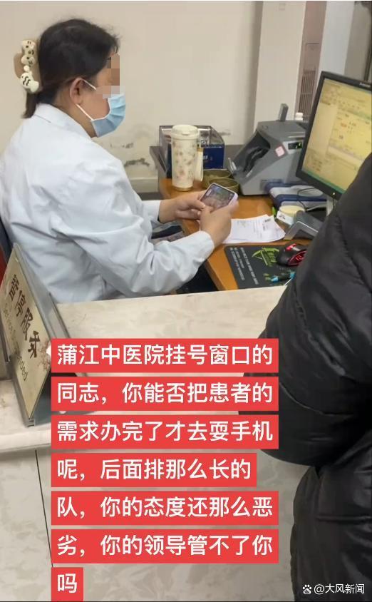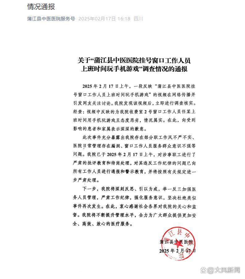 当天,该医院发布通报称,一段反映“蒲江县中医医院挂号窗口工作人员上班时间玩手机游戏”的视频在网络传播并引发网友关注讨论。我院发现该视频后,立即进行调查核实。经查:视频中反映的为我院收费室2号窗口工作人员任某上班时间用手机玩游戏且态度恶劣,情况属实。在此,向受到影响的患者和家属表示深深的歉意。