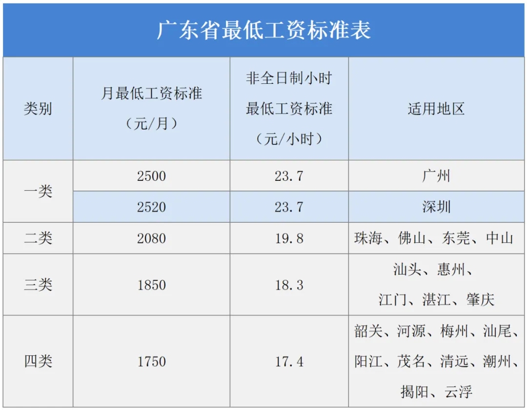 2月14日,广东省人民政府印发《关于调整我省最低工资标准的通知》(下称《通知》),决定从2025年3月1日起调整提高月最低工资标准和非全日制小时最低工资标准。此次调整后,深圳市全日制就业劳动者月最低工资标准调整为2520元/月,非全日制小时最低工资标准为23.7元/小时。