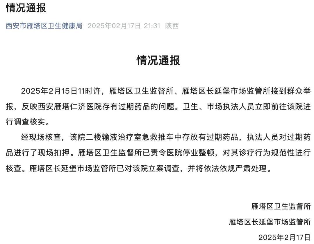 2025年2月15日11时许,雁塔区卫生监督所、雁塔区长延堡市场监管所接到群众举报,反映西安雁塔仁济医院存有过期药品的问题。卫生、市场执法人员立即前往该院进行调查核实。