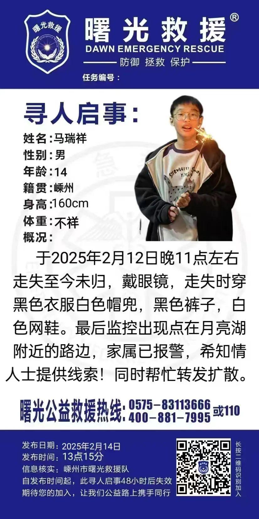 近日,有群众在短视频平台发布视频称,2025年2月12日,浙江省嵊(shèng)州市一男孩元宵节离家至今未归,孩子名叫马瑞祥,今年14岁,监控画面显示最后出现在月亮湖公园附近。