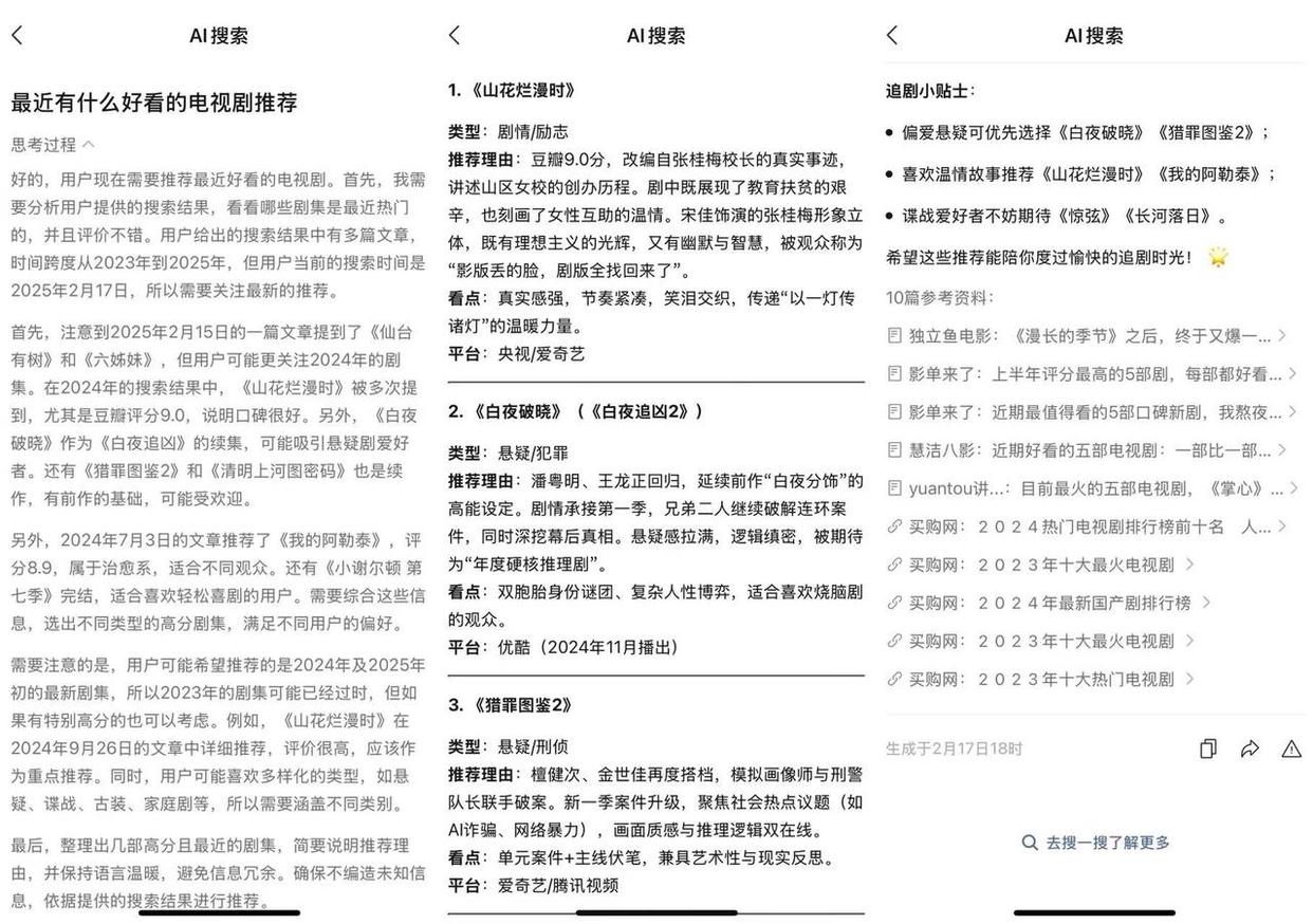林同学表示,过去微信搜一搜大多是依赖腾讯内部的内容,比如公众号和小程序的内容,虽然也能搜索一些外部的信息,但很大程度依赖内部资源。AI搜索的出现,不仅有内部的,还链接外部的互联网内容。如搜索“最近有什么好看的电视剧推荐”,除了腾讯视频相关内容,还会呈现其他平台的资讯和剧评。