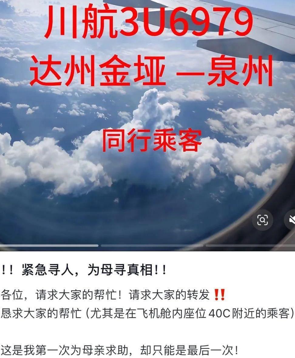 据媒体报道,2月13日,四川达州至福建泉州的川航3U6979航班上,一名旅客突发身体不适离世。该旅客家属王女士(化姓)称,母亲今年61岁了,有高血压史,但近两年没有重大疾病,平时还爱跳广场舞,事发前还发过广场舞视频。航司在媒体采访时称已尽到法律上的关照和服务,事发时乘务组广播寻找医生,但客舱乘客中没有医务人员,并同步按程序为旅客吸氧并实施心肺复苏。目前,家属希望找到同航班旅客,了解母亲在飞机上发病和救治的过程,还原真相。
