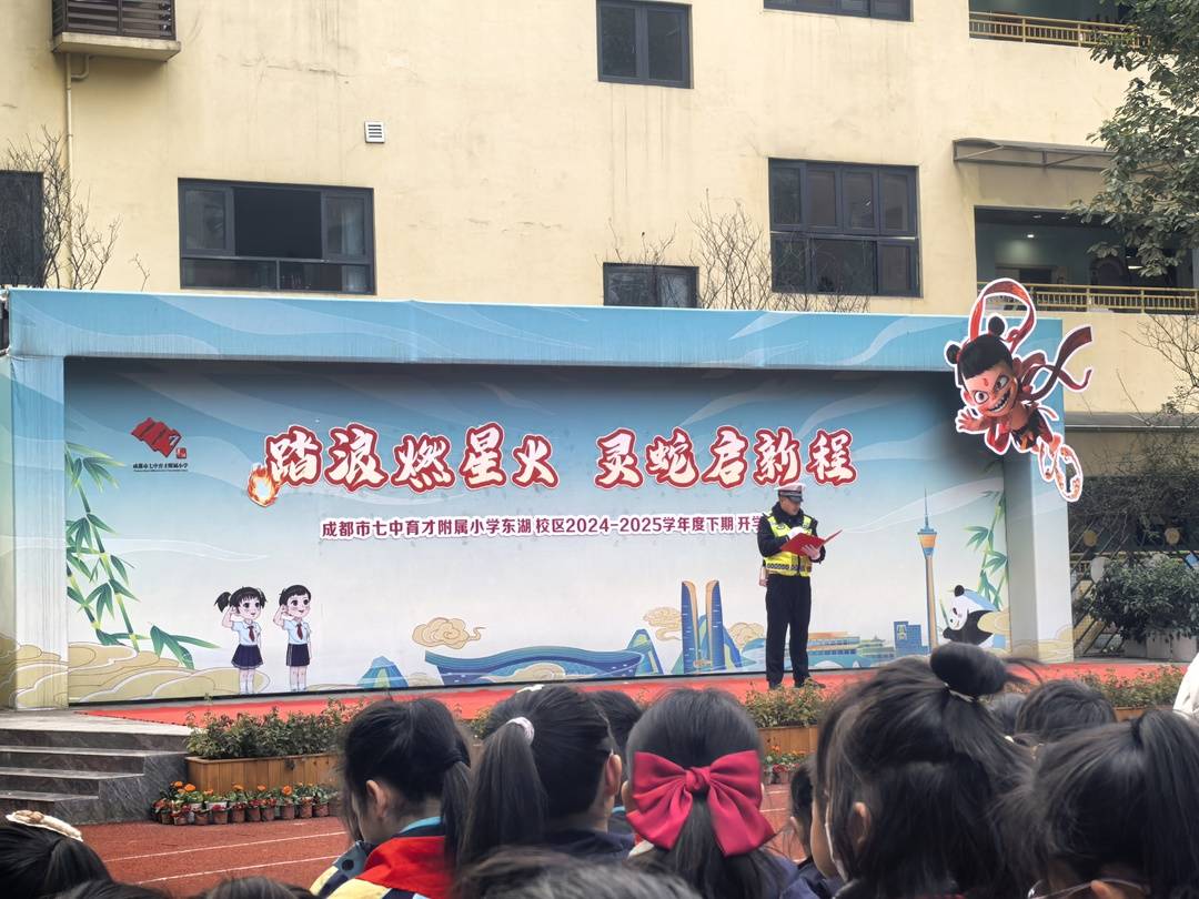 开学典礼上,三分局三大队警员何政轶向学生们阐述了交通规则的必要性和安全意识的重要性,倡导全体师生用实际行动共同维护安全、畅通的交通环境。