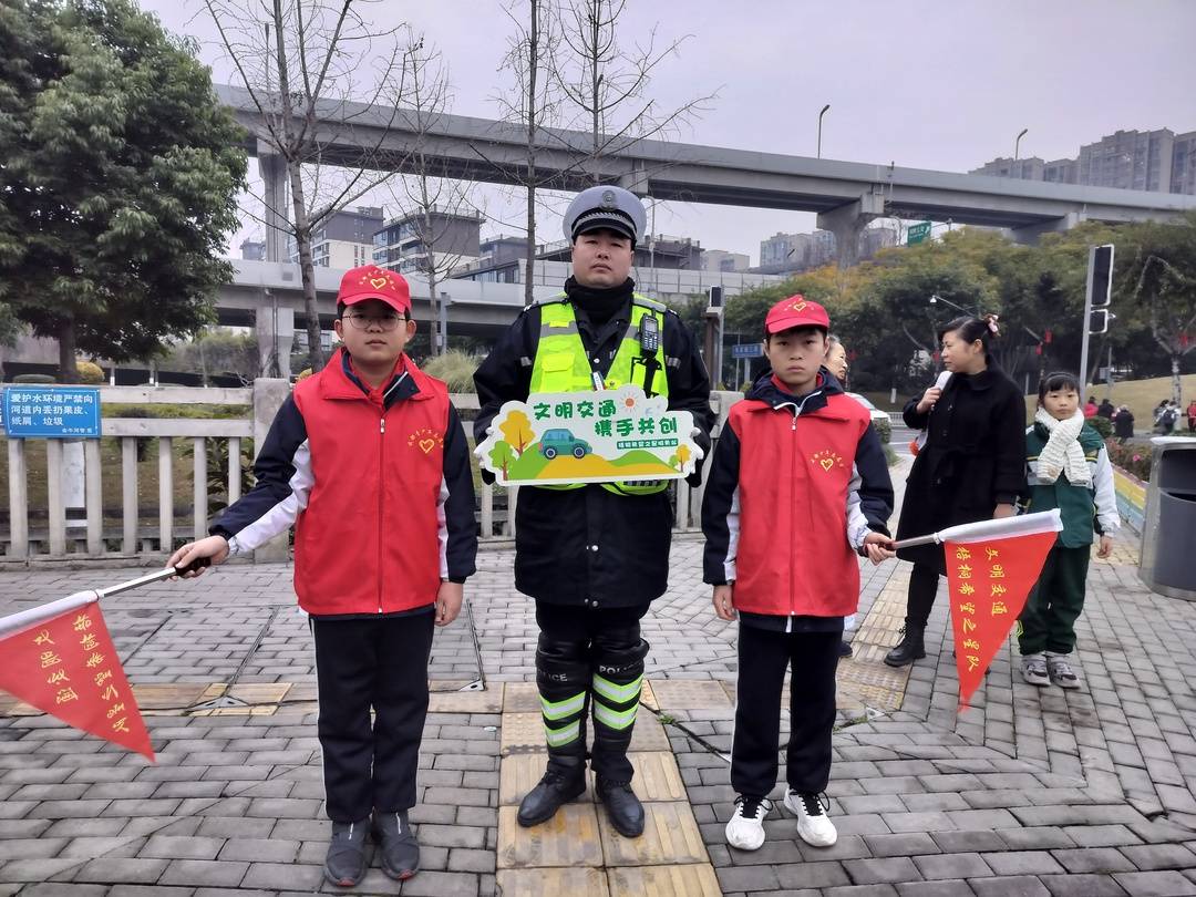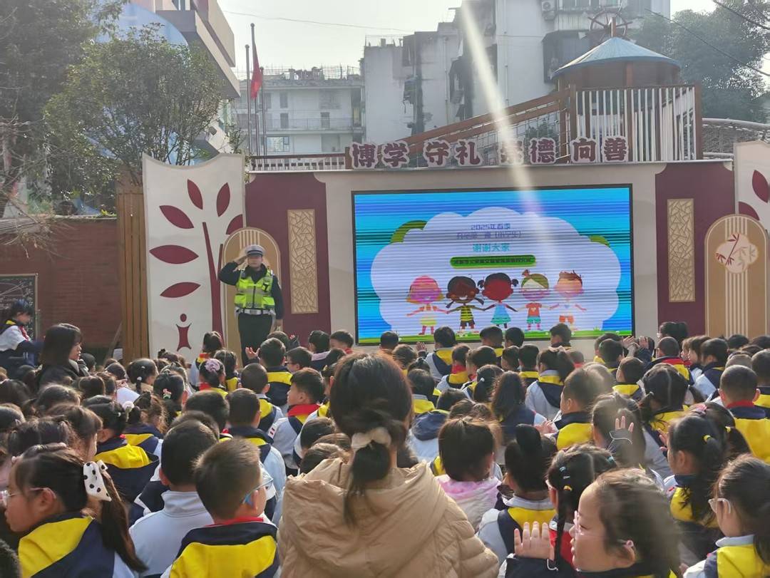当天,成都市铁路中学校梧桐分校的学生们在交警和教师的带领下,走上街头开展“文明劝导护平安”实践活动。在红绿灯路口,身着反光背心的小劝导员们手持提示牌,向过往车辆倡导礼让行人,并纠正非机动车闯红灯、骑乘人员未佩戴头盔等行为。在成都市友谊小学,交警通过警示视频、互动问答等形式,结合校园周边路况讲解步行、乘车安全要点;通过播放真实事故案例视频,交警以案释法,剖析闯红灯、鬼探头等行为的危险性,并号召学生争做“家庭安全宣传员”,带动家长共同践行文明交通。