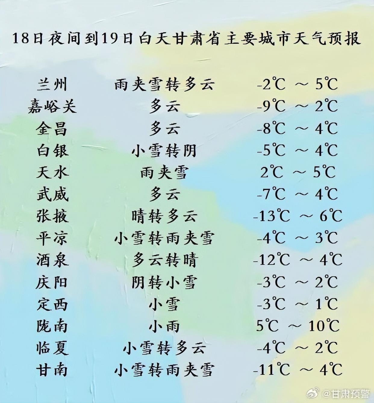 2月19日20时-2月20日20时,甘南、临夏、定西、兰州、陇南、天水、平凉、庆阳等州市阴转多云,部分地方有小雪(雨)或雨夹雪;省内其余地方多云或晴,祁连山区东部阴有小雪。