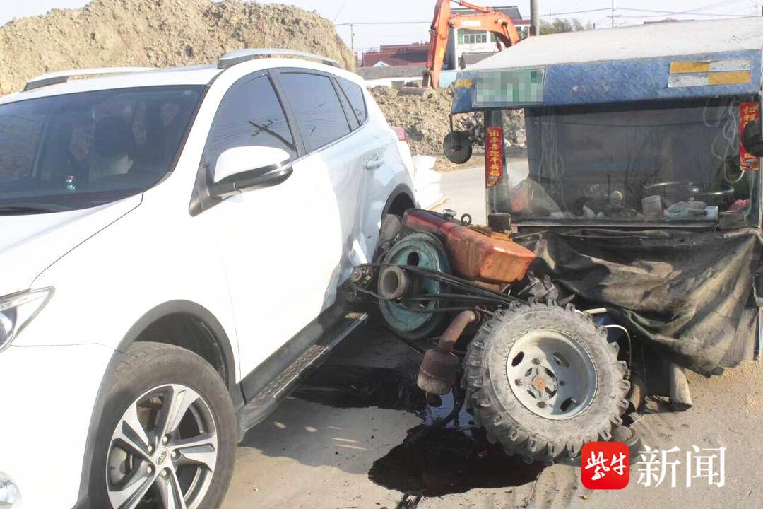 18日8时20分许,高邮市公安局交警大队汤庄中队接报,汤庄镇郭潘路,停在路边的轿车被一辆拖拉机撞坏。民警赶到现场调查得知,事发时,郤某(男,62岁)驾驶方向盘式拖拉机,沿郭潘路由北向南行驶。行驶至事发地点时,拖拉机机头突然断裂,随着“轰”的一声巨响,“分身”后的拖拉机机头撞上汤某(男,38岁)停在同方向路边的轿车,巨大的惯性,将轿车车身撞得凹了进去,所幸拖拉机驾驶员没有受伤,轿车里也没有人。