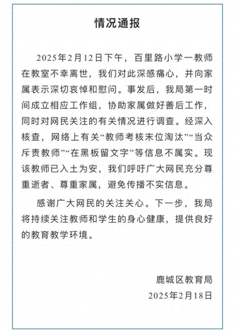 经深入核查,网络上有关“教师考核末位淘汰”“当众斥责教师”“在黑板留文字”等信息不属实。现该教师已入土为安,我们呼吁广大网民充分尊重逝者、尊重家属,避免传播不实信息。