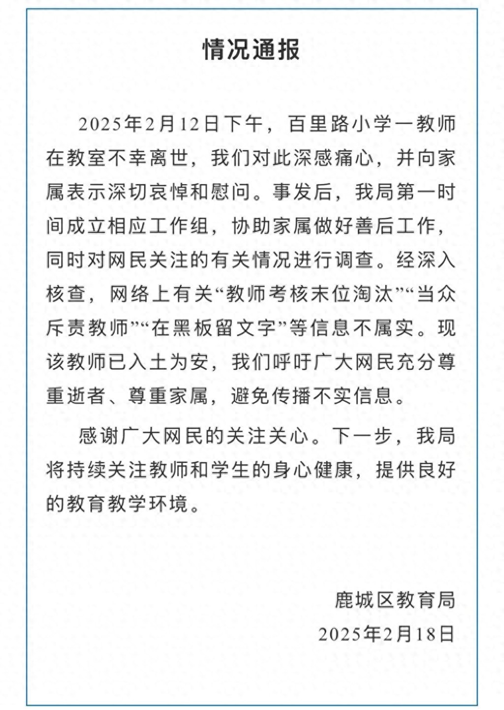 鹿城区教育局呼吁广大网民充分尊重逝者、尊重家属,避免传播不实信息。
