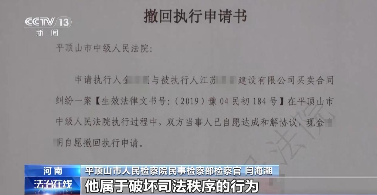 平顶山市人民检察院民事检察部检察官 闫海潮:9000多万元,拿回了1893万元,还剩7000多万元,主要的钱都没有拿到,他竟然申请撤回执行了。能够看出他所要查封的,他所要执行的指向就是这个工程款,而不是数额是多少。