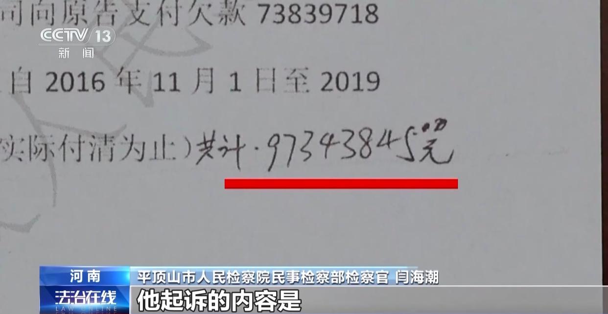 平顶山市人民检察院民事检察部检察官 闫海潮:他起诉的内容是他向江苏这家企业在平顶山的工地供应钢材,大概供应了4000多万元钢材,然后加算了2000多万元利润,再加上2000多万元的利息,总共欠付是9800万元左右。