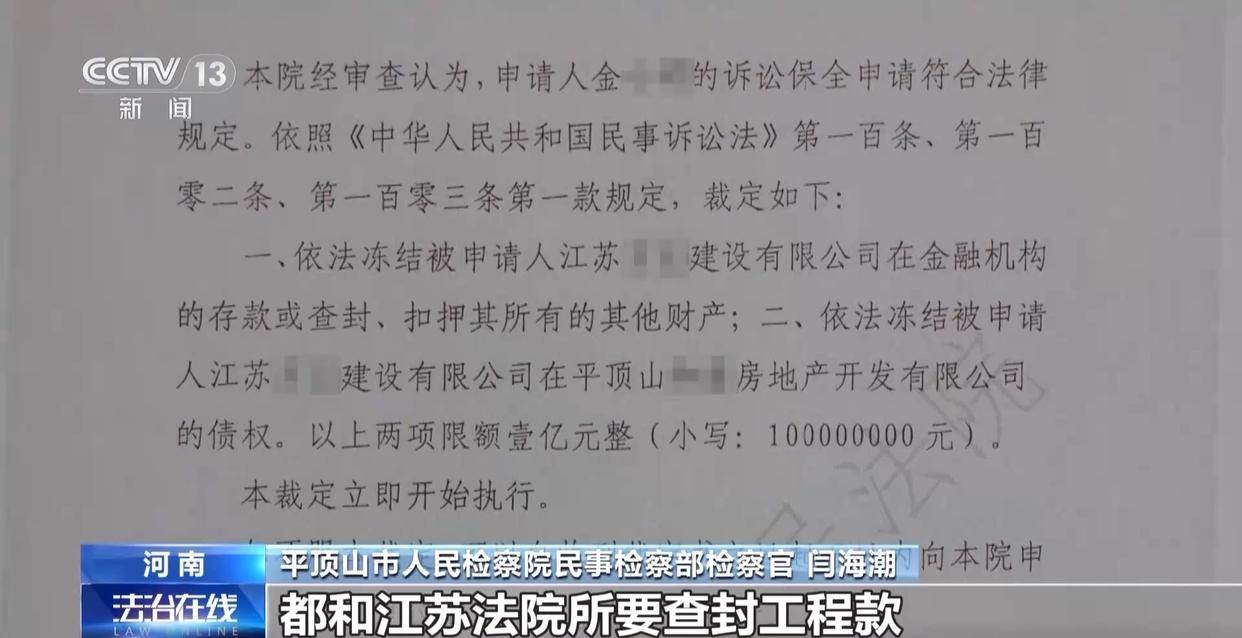 平顶山市人民检察院民事检察部检察官 闫海潮:他起诉的时候,他申请查封的数额、申请查封的指向、诉讼标的额,都和江苏法院所要查封工程款存在着对应。