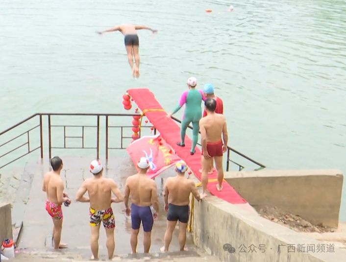近日,在南宁邕江北岸古城墙下,一群冬泳爱好者搭建了一处跳水胜地,独特的跳水方式吸引不少市民驻足围观。记者看到,在古城墙台阶旁的栏杆上,有一块竹板特制的跳板,跳板尾端用绳索紧紧固定于护栏之上,板面上则包裹一层鲜艳的红毯,前端还悬挂着喜庆的红灯笼。据现场的冬泳爱好者说,这个地方是经过安全评估后挑选出来的。以前,他们在江对面跳,但那边水位太浅,这边水深3米至5米,相对比较安全。