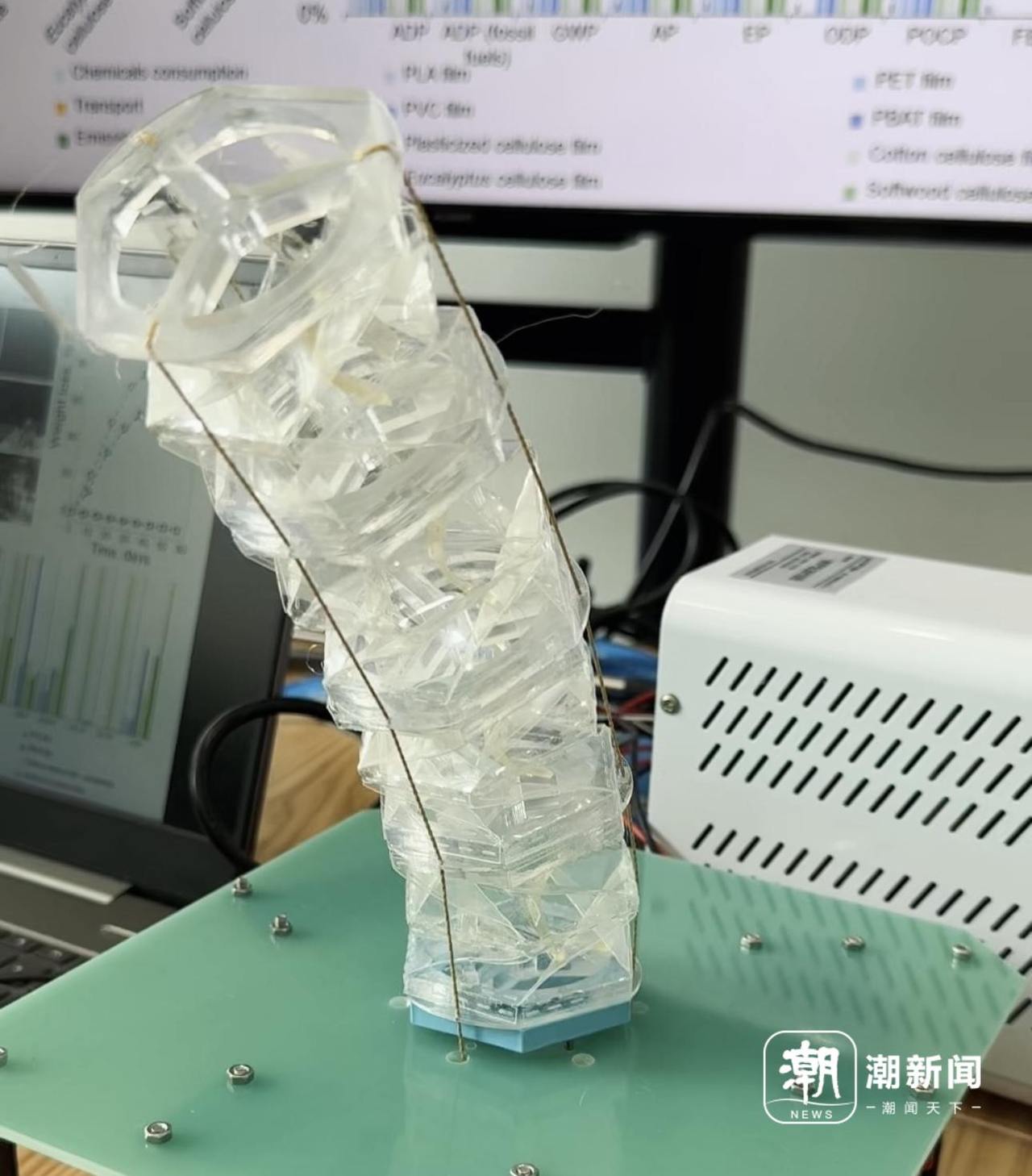 采访当天,记者见到了这个有趣的“小玩意”,透明状,上面交错着一些类似螺旋纹的形状。通电后,它可以接受遥控指令,向不同方向,以不同角度弯曲或扭动——一会儿像一条“有生命”的尾巴,一会也能弯成字母“S”的形状。