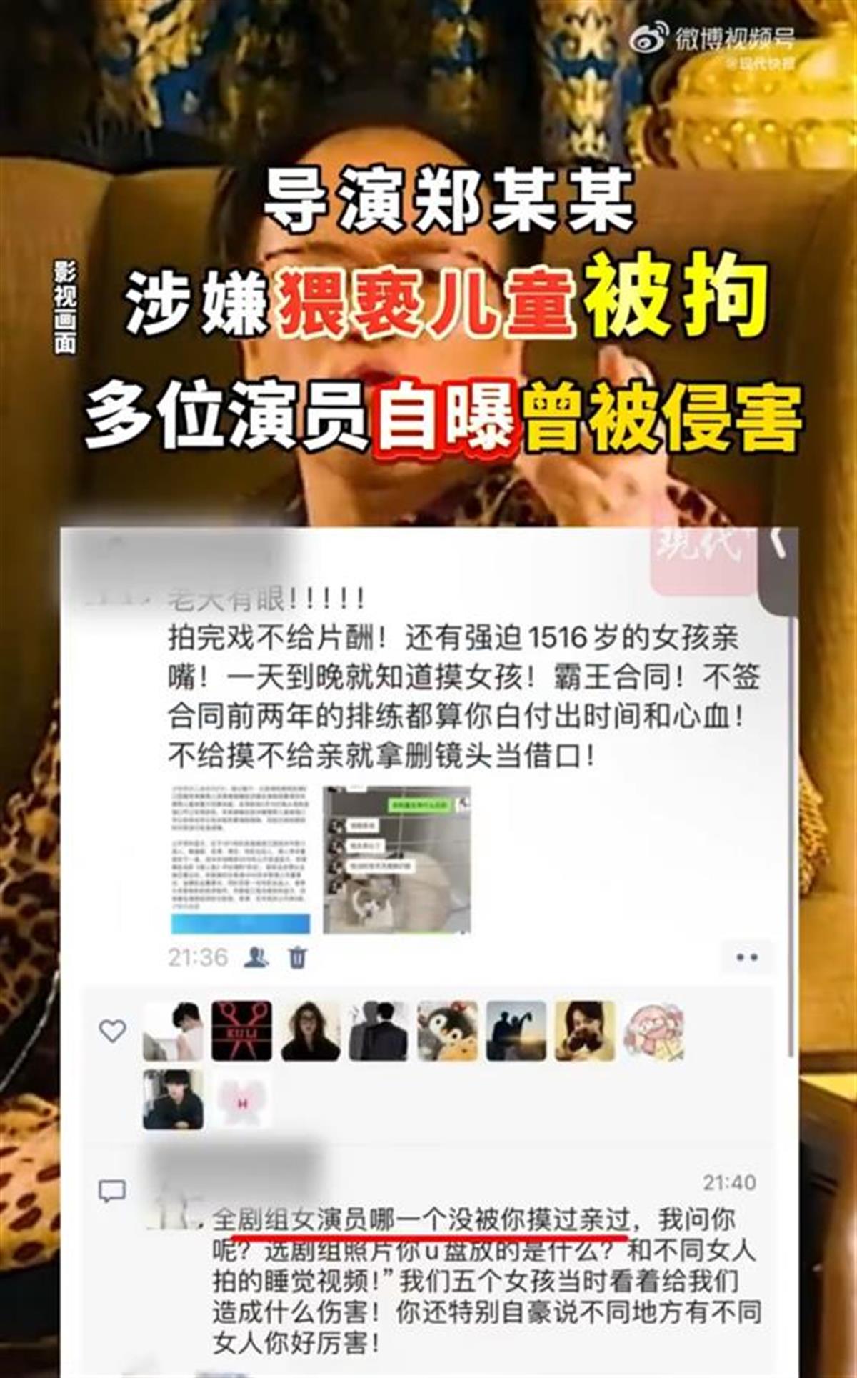 据现代快报2月20日报道:郑某某被捕后,有多位演员在网络上曝光被导演郑某某侵害的经历。
