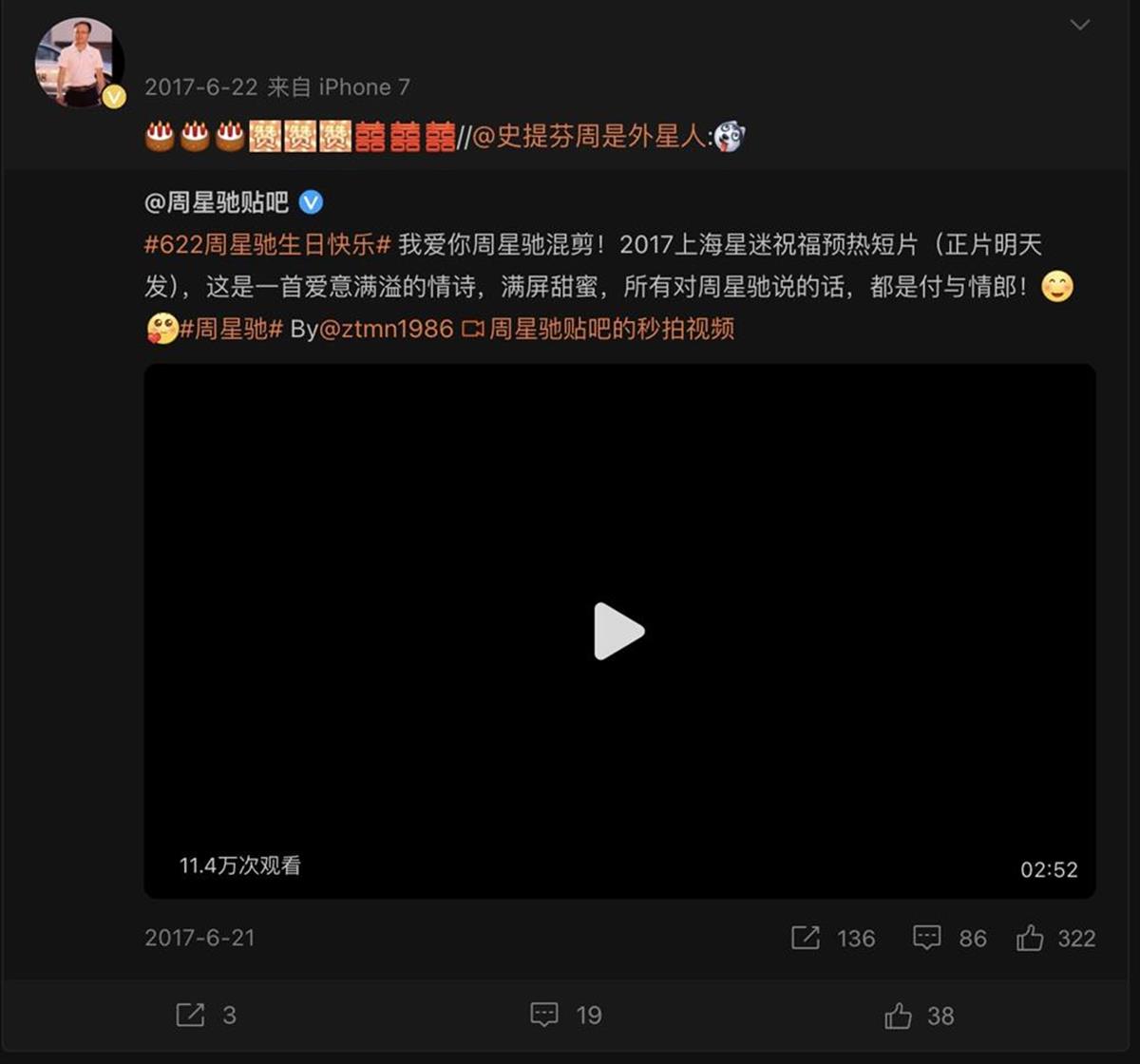 极目新闻记者注意到,郑某峰只发了140多条微博,绝大部分是关于《美人鱼》和《西游伏妖篇》的。他只关注了三个账号,分别是上述两部电影的微博,以及周星驰相关的一个账号。2016年和2017年,他两次发微博祝周星驰生日快乐。在微博的简介当中,他自称是广告拍摄专家,周星驰拍档。西游系列电影出品人,《猪八戒传说》电影编剧、导演、制片人。