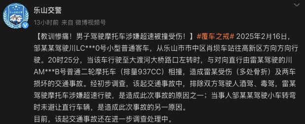 据乐山市交警支队通报,2月16日,邹某某驾驶川LC***0号小型普通客车,从乐山市市中区肖坝车站往高新区方向方向行驶。20时25分,当该车行驶至大渡河大桥路口左转时,与对向直行由雷某驾驶的川AM***B号普通二轮摩托车(排量937CC)相撞,造成雷某受伤(多处骨折)及两车损坏的交通事故。