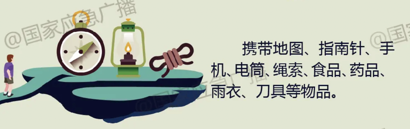 要随身携带口哨、手电等应急装备,以及应急食品和必要的急救药品等。