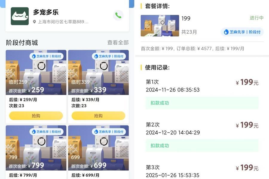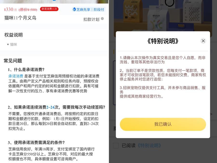 记者在支付宝平台搜索“文魄科技”,会显示“文魄承诺消费宠物”的小程序,全国已有多家宠物商店入驻,推出按月支付的售卖模式。所谓“承诺消费”,实际上是基于支付宝芝麻信用预授权功能的支付方式。商户端可定义产品相关规则和任务内容,预授权会依据商户和用户约定的时间和金额进行扣款。也有商家向记者强调,消费者每支付一笔款项,商家才可收到该笔款项。如果未按时缴费,商家有权停止服务并进行追偿。也就是说,平台为商家赋予了中止付款的权利,而消费者处于相对被动的位置,合同解除的代价高昂,缺少有效申诉的渠道。