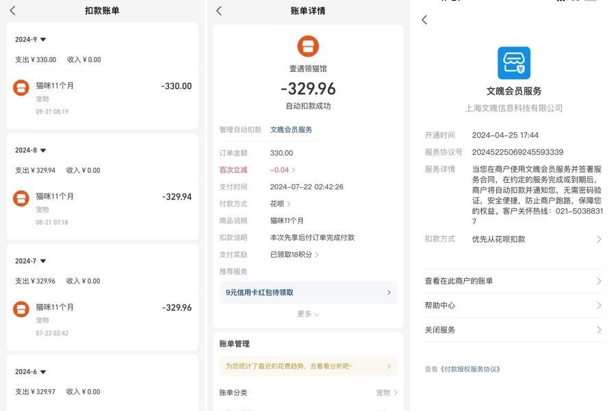 郦先生的支付记录显示,扣款性质属于先享后付,管理自动扣款的公司是上海文魄信息科技有限公司(以下简称“文魄科技”)。扣款说明提到:“当您在商户使用文魄会员服务并签署服务合同,在约定的服务完成或到期后,商户将自动扣款并通知您,无需密码验证。”尽管该公司提供了客服热线,但记者多次拨打都无法接通。