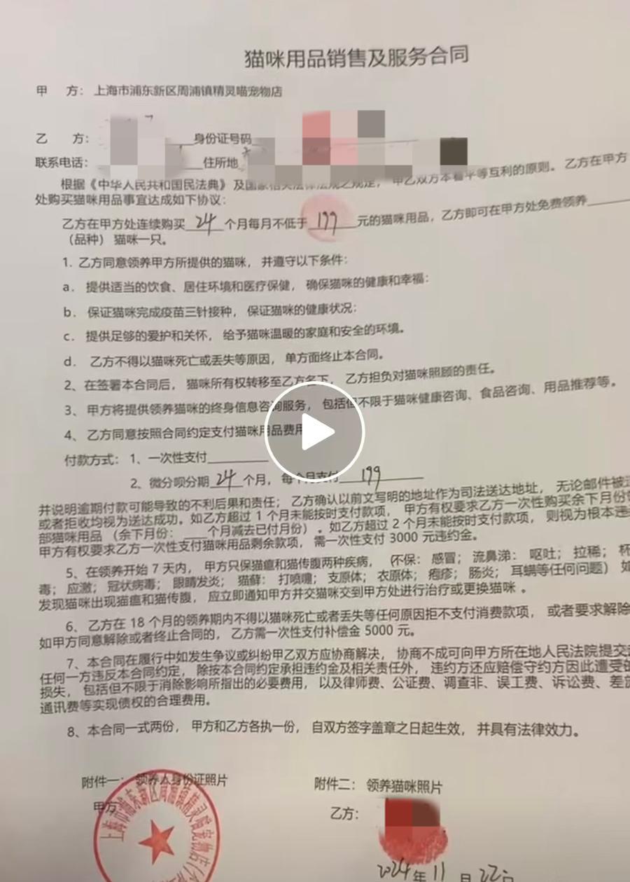 小李与这家“猫咪免费领养馆”签署的纸质合同被命名为“猫咪用品销售及服务合同”。“免费领养”字眼出现在第二段,“乙方在甲方处连续购买24个月,每月不低于199元的猫咪用品,乙方即可在甲方处免费领养品种猫咪一只。”甲方还能提供什么服务?记者翻到一行:提供领养猫咪的终身信息咨询服务。此外,只在领养开始的7天内,保障猫瘟和猫传腹两种疾病。所谓的报销医药费的口头承诺并没有落到纸面上。