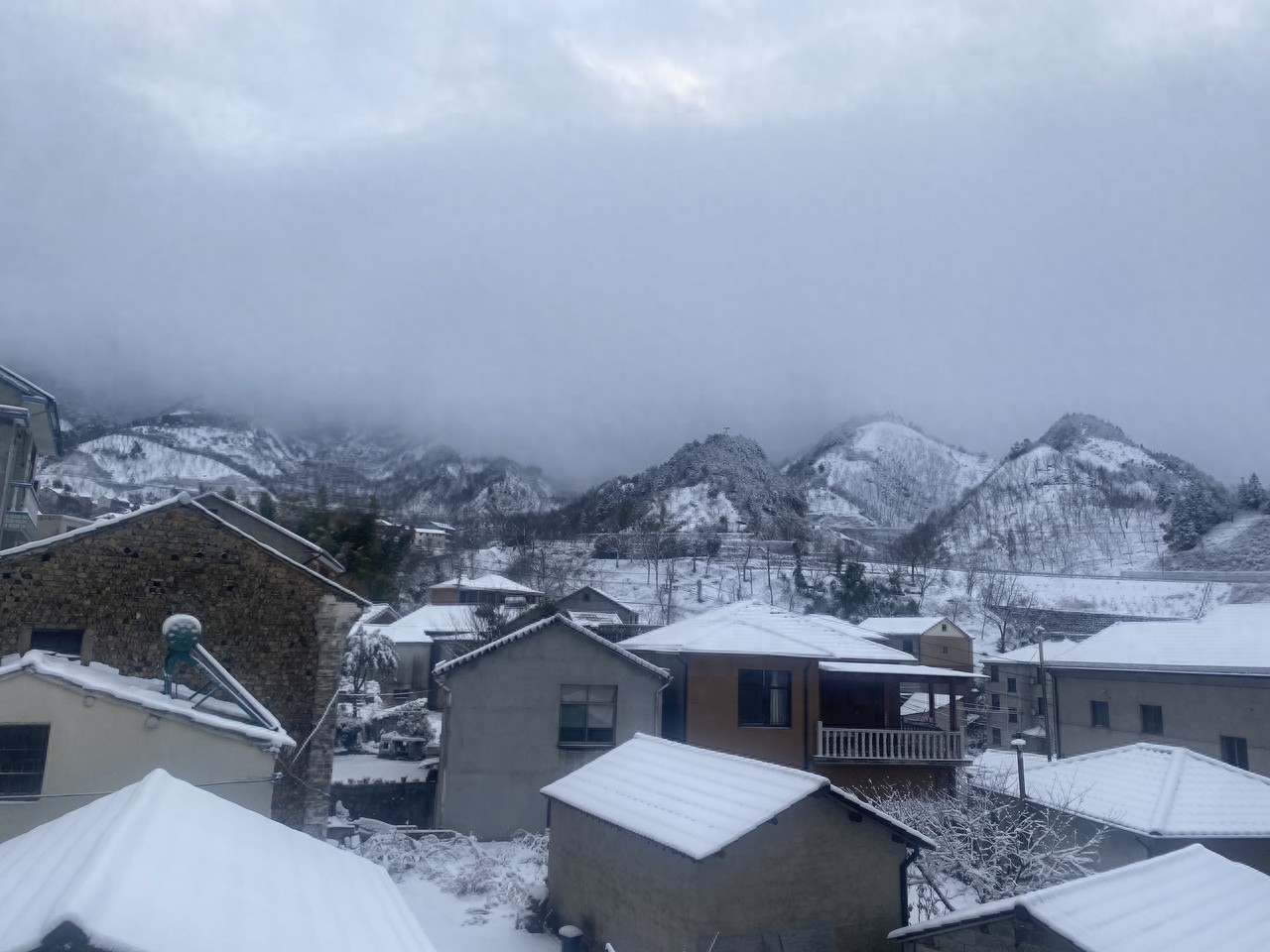 太子尖山脚的清凉峰镇浪广村,海拨800米。当地村民陈先生告诉记者,没有走过的地面、屋顶和远山上都有积雪覆盖,积雪厚度有10厘米。